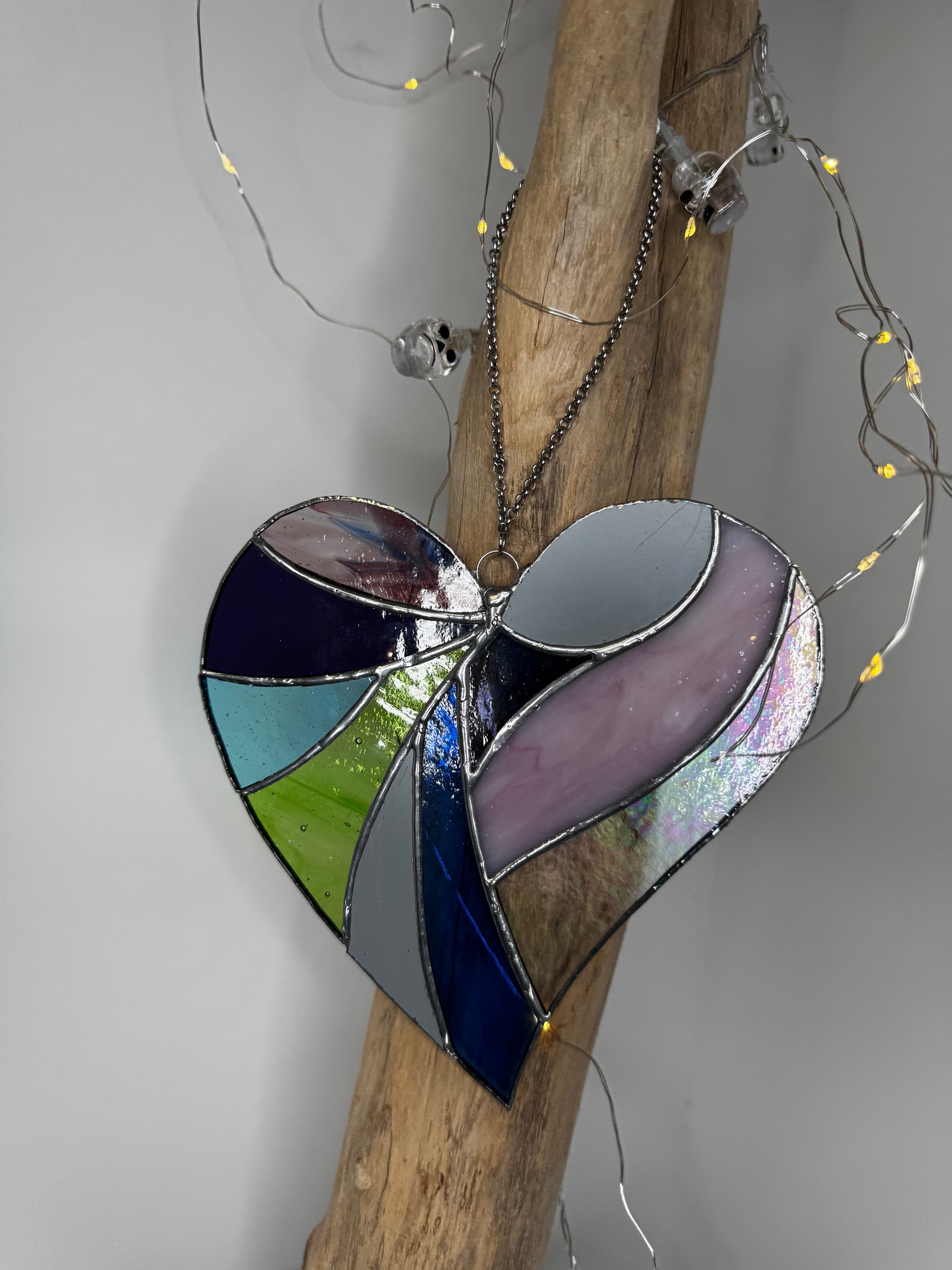 Les nuances de bleu, vert, gris, rose opalin et verre irisé captent la lumière naturelle pour créer des reflets changeants et délicats. Suspendu près d’une fenêtre ou dans un espace lumineux, ce vitrail diffuse une atmosphère douce, chaleureuse et apaisante.